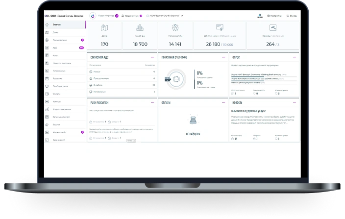 - Массовые оповещения: Функционал для создания аварийных отключений, рассылки объявлений и новостей жителям.